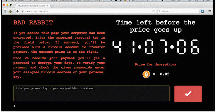 Llamado como «Bad Rabbit» (Win32/Disckcoder.D, Disckcoder.Petya.D), este ransomware es una nueva versión de Petya (Win32/Diskcoder.C) que demanda el pago de 0.05 BTC para desbloquear sus sistemas. Los sistemas cifrados tienen la extensión .encrypted
